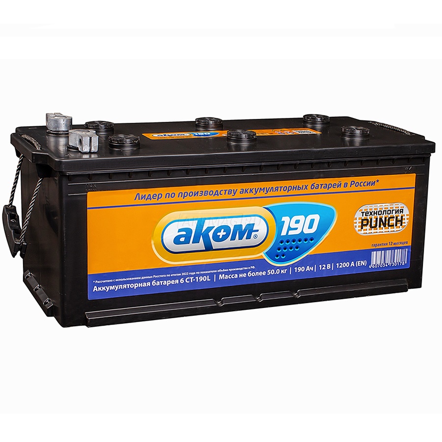 Аккумулятор автомобильный АКОМ 190 рус 1200 А прям. пол. 190 Ач (4607034730178)